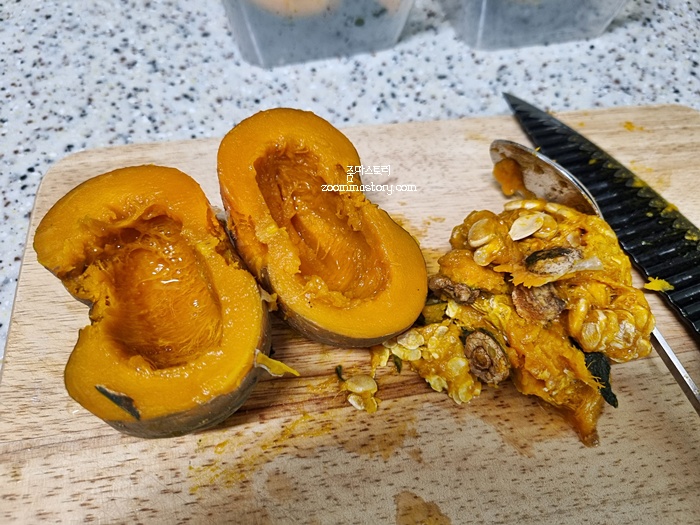맛있게 쪄낸 단호박은 한 김 식혀서 숟가락을 이용해 속을 파내고 먹기 좋은 크기로 자르며 되세요.