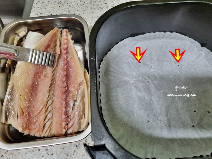 대부분 생선구이를 할 때 들러붙지 마라고 종이포일을 많이 사용하고 있을거예요. 저도 자주 사용하는데요. 종이호일을 넣고 생선을 올려 바로 굽는 것이 아닌 전 한 번 더 손을 봅니다. 그건 바로 종이포일에 구멍을 뚫어 주는 것입니다.
