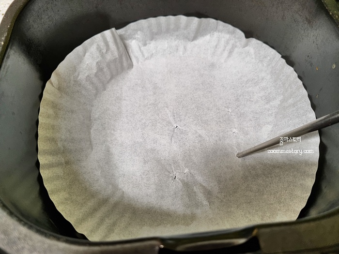 구멍을 뚫을 때는 젓가락으로 이용하면 수월하게 할 수 있어요. 구멍은 기름이 아래도 빠질 정도의 몇 개만 뚫으셔도 됩니다. 전 한 10개 정도의 구멍을 뚫었어요.