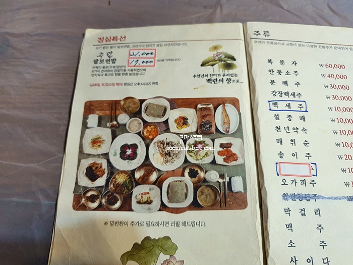 메뉴판도 너덜너덜 할 정도로 세월의 흔적을 엿 볼 수 있다. 우린 점심특선을 주문하기로 했다. 평일, 주말의 가격이 다르니 참고하길...우린 주말에 가서 1인 21,000원에 식사를 했다.