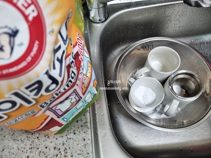 큰 볼에 씻어야 할 그릇들을 다 담아 주시고요. 그 안에 베이킹소다를 뿌려 줍니다. 그리고 뜨거운 물을 부어 준 뒤 약 30분 정도 방치한 후에 수세미를 이용해 닦으시면 되세요. 생각보다 간단한데 효과는 정말 좋답니다.