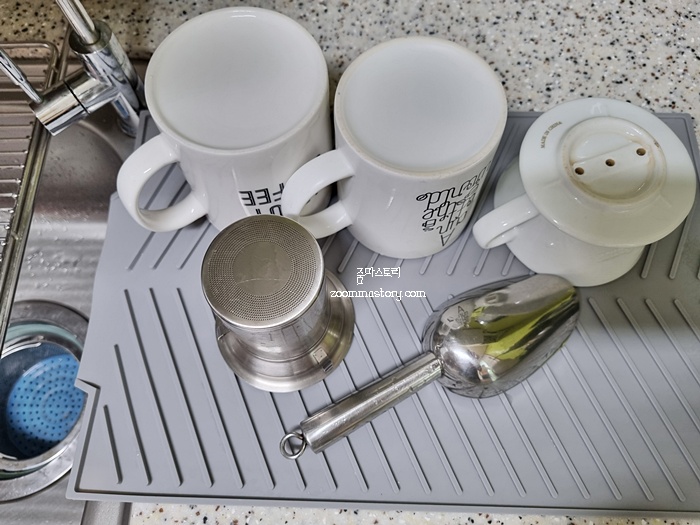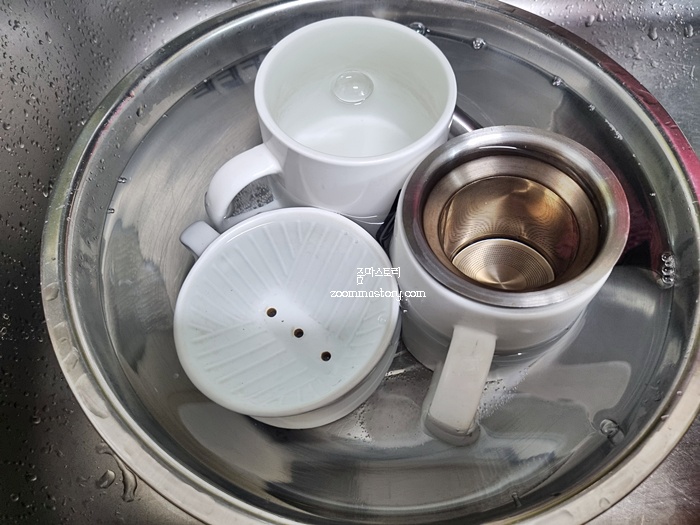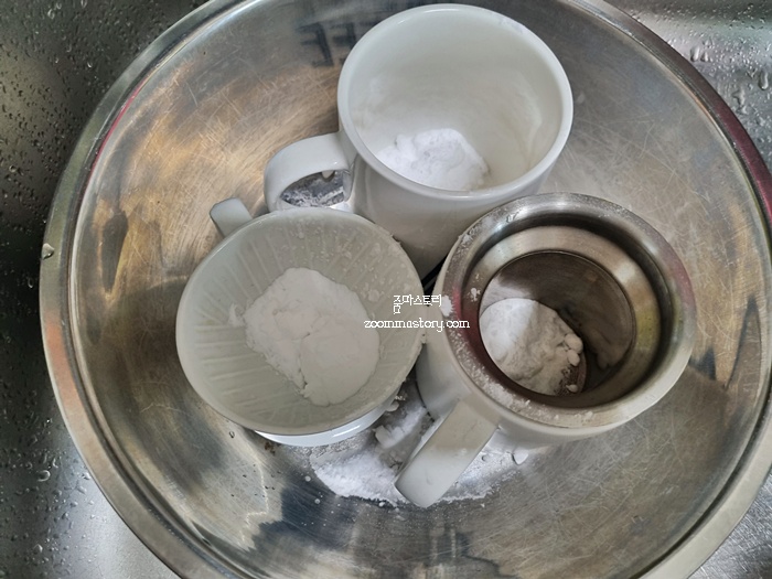 커피를 자주 마시다 보니 컵에 얼룩이 착색되어 있는 경우도 문제없이 해결 가능해요. 전 오늘 녹차를 우려 마셨던 차 거름망과 핸드드립 커피를 내려 마시는 드리퍼, 컵을 깔끔하게 세척해 볼겁니다. 여기서 필요한 것은 베이킹소다 + 뜨거운 물입니다.