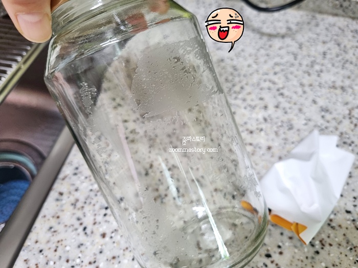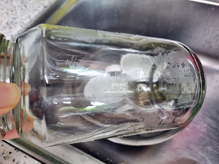 유리병을 재사용 하는 분들 은근히 많죠. 유리병을 그냥 버리기엔 왠지 아쉽다는 분들은 깨끗이 씻어서 양념통등으로 재사용 하는데요. 유리병에 붙어 있는 스티커를 제거하다보면 끈적한 얼룩이 묻어 있는데 이것도 간단히 해결 가능해요. 이 또한 베이킹소다 + 뜨거운 물을 이용하면 되는데요. 전 컵을 담궈 놓았던 베이킹소다물에 담궈서 재사용 했답니다.