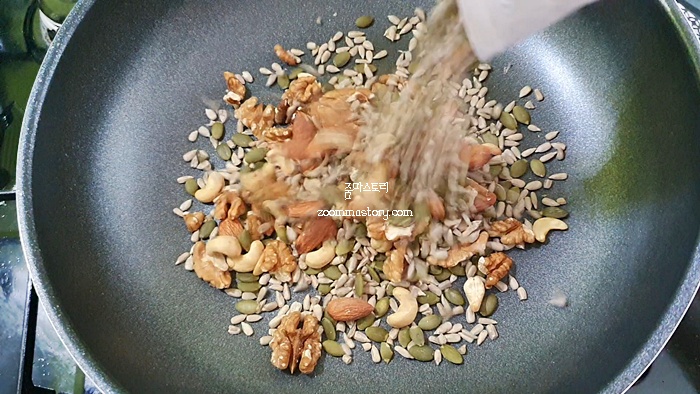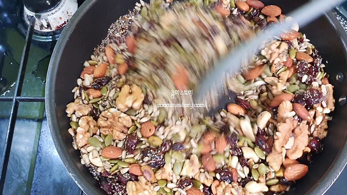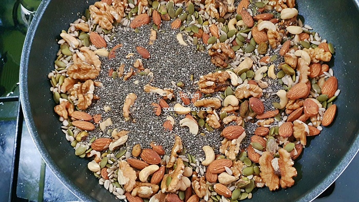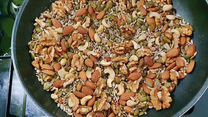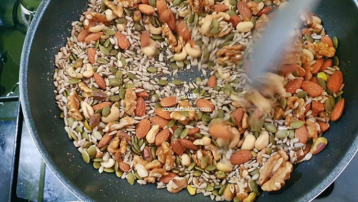 1. 견과류를 달궈진 프라이팬에 볶는다. 볶을 때 순서는 큰 견과류 위주로 먼저 볶은 뒤 가루류의 견과를 볶으면 된다.