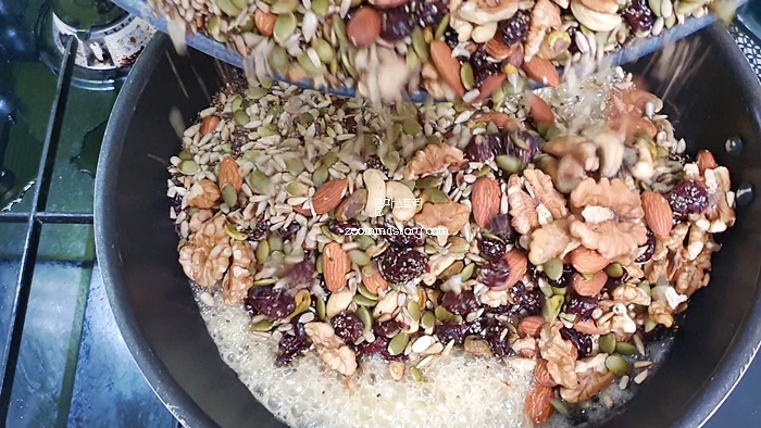 4. 꿀이 기포를 내면서 끓어 오르면 볶아 놓은 견과류를 넣어 섞는다.