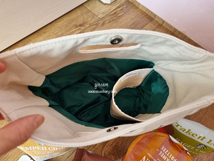 가방 안을 자세히 보면 도시락 정도는 들어갈 수 있고 텀블러를 따로 넣기 편하게 제작되어 있다. 개인적으로 자주 들고 다닐 것 같다. 한정판이라 많이 나오지 않기에 일단 내것을 먼저 구입하기로.... 여유가 있으면 몇 개 사놓고 싶을 정도라는 생각이 약간 들긴 했다. 선물용으로 말이다.