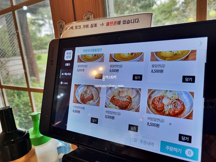 테이블에 앉으면 키오스크가 있다. 거기서 메뉴 주문과 동시에 결재를 하면 된다. 우린 비빔밀면과 물밀면을 주문 했다. 가격은 각각 8,500원이다.