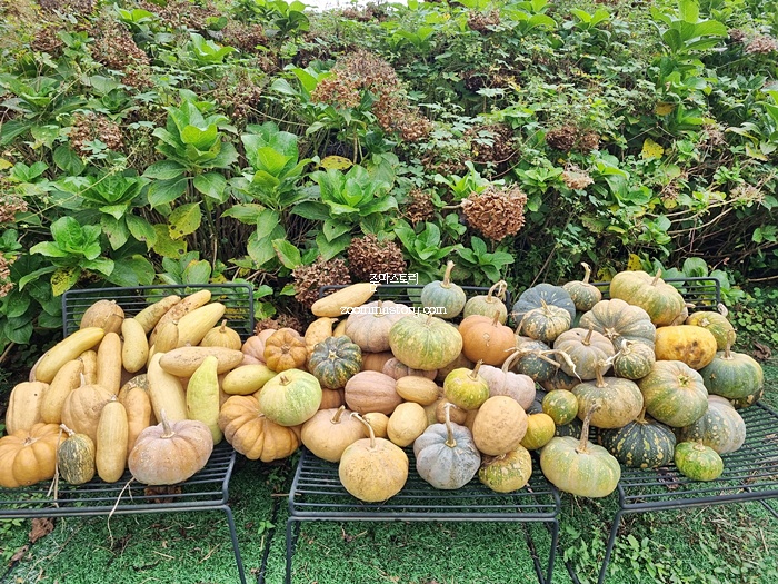 넓은 마당을 중심으로 인테리어도 잘 해 놓았고 요즘 많이 나오는 호박도 갖가지 종류별로 진열해 놓으니 더 운치가 있어 보였다. 밀면을 먹으러 갔다가 웨이팅이 있어서 잠깐 둘러본 마당은 볼거리가 가득했고 사진 찍기도 좋았다.