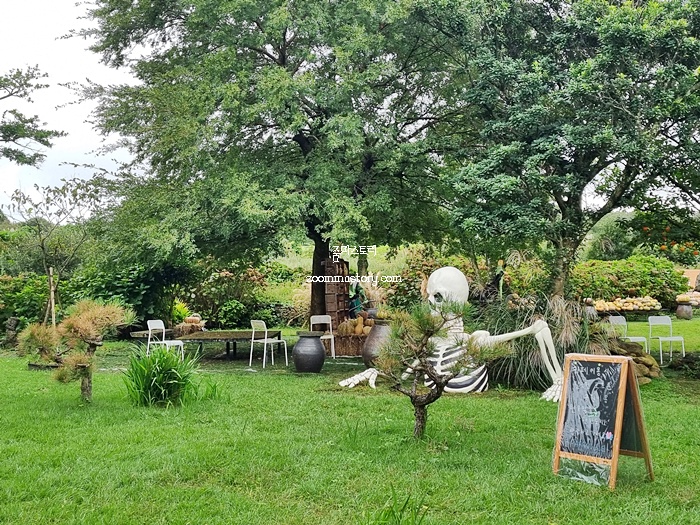 핼러윈데이에 어울리게 잘 꾸며 놓았다. 마당이 넓은 관계로 이런 인테리어도 가능하다는 것이 제주도만의 장점일지도 모른다. 자연과 어울리는 인테리어에 이국적인 느낌도 많이 들긴 했다. 가을이 성큼 다가오긴 했지만 여전히 제주도는 낮기온이 28도를 육박하는 날씨다. 10월 말까지 이런 날씨가 계속된다고 하니 가을이 너무 짧은 게 아닌가 하는 생각에 조금은 씁쓸해진다. 보통 11월이면 초겨울 느낌이 나는데 제주도는 아마도 그때쯤이면 가을 느낌이 나는 날씨가 계속되지 않을까 싶다.