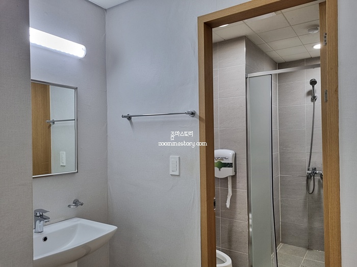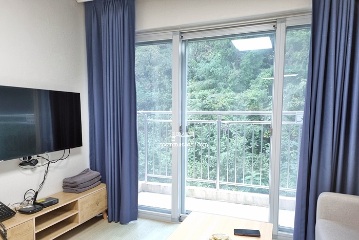 거실 문을 열면 초록초록한 산 뷰가 인상적이다. 마치 제주도 온 듯한 느낌도 들었다. 욕실에는 샴푸만 있으니 이곳에 갈 때는 바디크렌저, 치약, 칫솔은 다 챙겨 가야 한다.