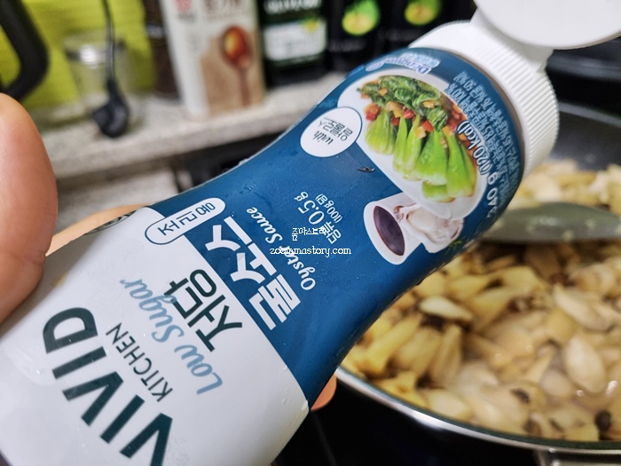 미니새송이 버섯이 워낙 많았던터라 굴소스와 알룰로스 양을 눈대중으로 넣었다. 몇 g 정확하진 않아도 주부 경력이 오래되다 보면 자연스러운 현상이니 만약 따라 하실 분들은 처음에 조금씩 양을 늘려 맛을 보면서 하면 될 듯하다. 요즘에는 워낙 요리블로거님들이 꼼꼼히 레시피를 적어 놓으니 그걸 참고하는 것도 좋을 듯하다.