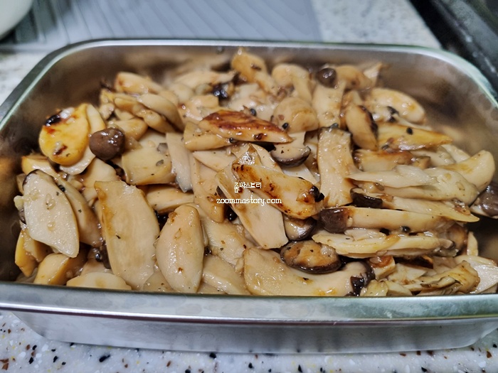 냉동되어 있던 새송이는 해동 후 물기를 꽉 짜서 제거해 준 뒤 요리한다. 프라이팬에 제일 먼저 간마을과 오일을 넣고 볶은 후에 새송이 버섯을 넣고 같이 볶아 준다. 그리고 난 뒤 양념을 넣어 졸여준다.