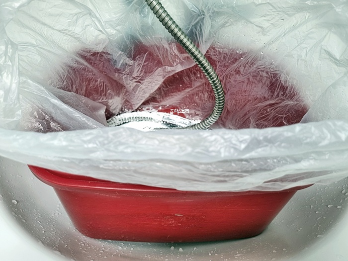 뜨거운 물을 부었다면 비닐봉지 윗부분을 밀봉해 약 30분 ~ 1시간 정도 두는데 난 물이 식은 후에 바로 꺼내 세척했다.