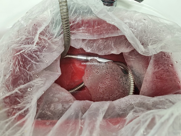 아직 솔로 닦지 않았음에도 이렇게 물때가 깔끔하게 제거된 상태다. 완벽하게 세척하기 위해서는 안 쓰는 칫솔을 이용해 한 번 더 꼼꼼히 닦아주면 더 확실하게 세척이 된다.