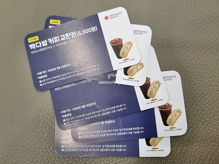 헌혈을 하고 나면 예전에는 영화관람권으로 받았는데 작년 말부터 그게 없어졌다고 해 지금은 커피 교환권으로 받는다. 제주도에는 전망도 좋고 넓고 쾌적한 빽다방이 많아서 이렇게 모아 두었다가 드라이브할 때 한 번씩 가서 사용하면 좋을 것 같아서다. 하여간 지금은 잘 가지 않아 하나둘씩 커피 교환권이 쌓이고 있지만......