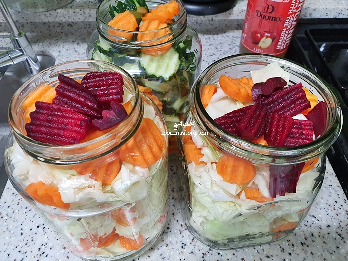 초보자도 쉽게 만드는 피클 안녕하세요 줌마스토리입니다. 어제 마트에 가니 채소가격이 많이 내렸더라고요. 그래서 양배추, 오이, 애호박등 종류별로 사왔답니다. 그런데 냉장고에 넣을 자리가 없어서 엉겁결에 냉장고 안 채소 정리를 했어요. 오이 2개, 양배추 반통, 당근 2개등 빨리 먹어야 할 것을 꺼내 피클을 담았답니다. 피클 담기는 의외로 간단합니다. 자세한 피클 담는 레시피는 따로 링크 걸어 둘테니 자세한 내용은 참고하시길 바라요. 초보자도 쉽게 피클 담는 법 초보자도 쉽게 피클 담기피클 레시피 어렵지 않아요!안녕하세요 줌마스토리입니다. 채소 가격이 저렴해 몇 가지 사와서 오늘은 피클을 담기로 했답니다. 채소 반찬은 사실 잘 안 먹게 되는데 피클을 담으면 꽤나 빨리zoommastory.com 피클로..