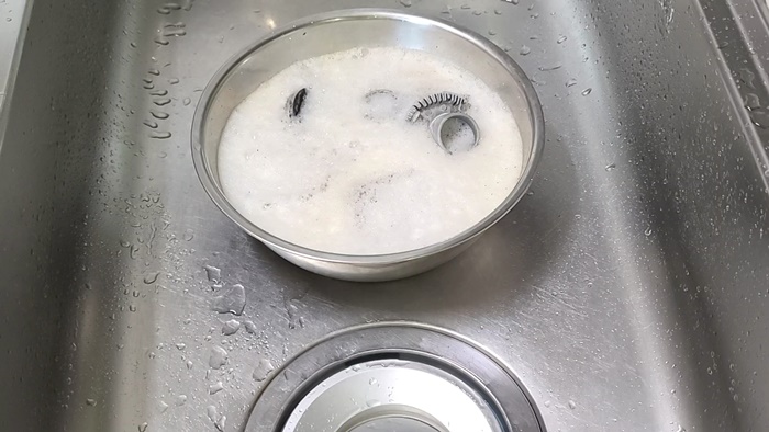 부속을 볼에 담은 뒤 뜨거운 물을 부어주고 약 10분 정도 방치한다. 때가 많을때는 시간을 더 있어도 무방하다.