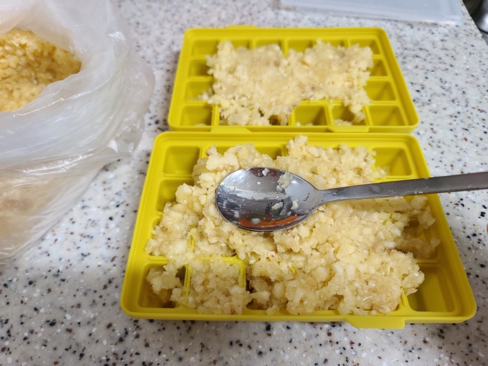 100% 마늘을 갈아서 사오자마자 바로 틀에 넣어서 냉동실에 보관한다. 틀도 냉동된 마늘이 잘 떨어지게 실리콘으로 된 것을 준비한다.