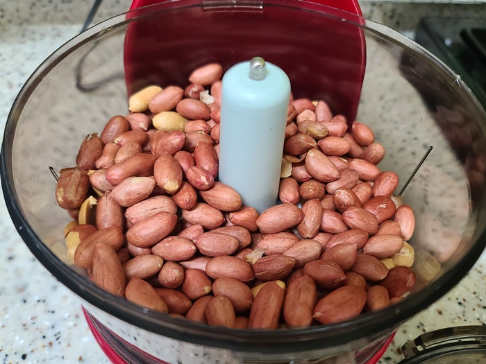 먼저 구운땅콩을 넣어서 분쇄합니다. 참고로 땅콩껍질은 같이 넣어도 되는지에 관한 말들이 있을 텐데요. 보통 시중에 파는 땅콩버터 대부분은 이렇게 껍질째 만든 것입니다. 그러니 껍질을 벗겨 사용하고 싶으신 분들은 알아서 제거해 분쇄하시면 됩니다.