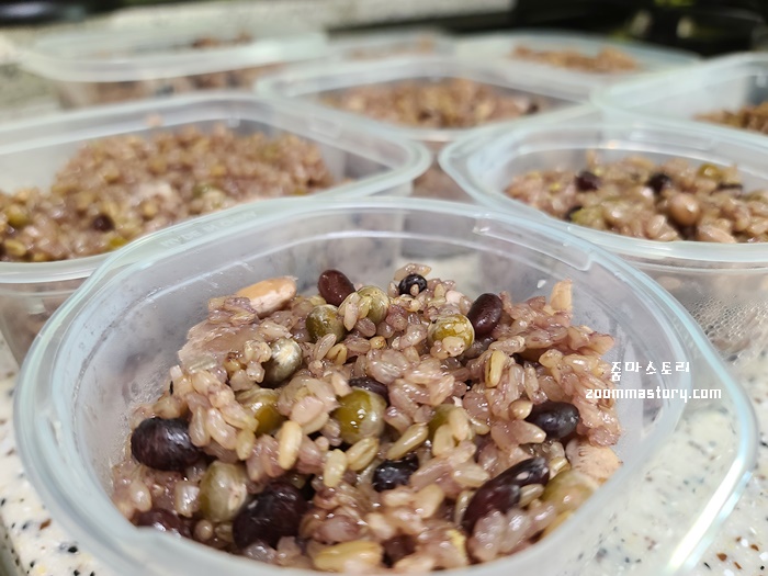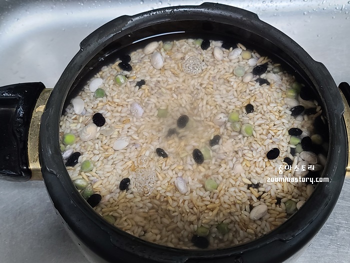 이른 아침.... 잡곡을 물에 불리고 압력밥솥에 담으니 꽤 양이 많았다.