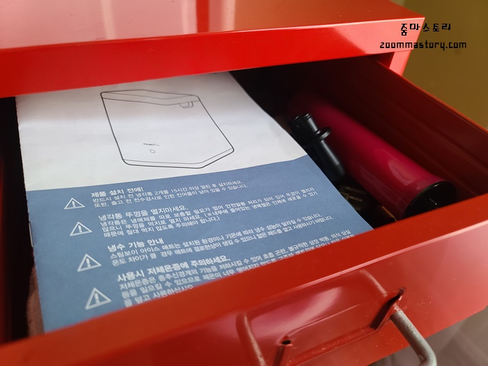 물 뺄 때 사용하는 부속품과 펌프도 찾기 쉽게 바로 서랍 속에 설명서랑 잘 넣어 뒀습니다.