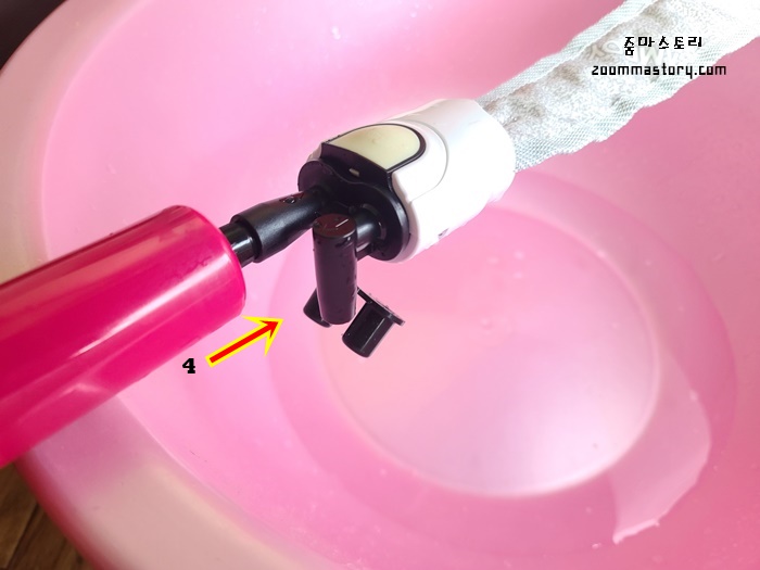 * 매트 끝부분의 구멍을 물 뺄때 사용하는 전용 부속품을 끼워 펌프질 하면 물을 제거해 줍니다.