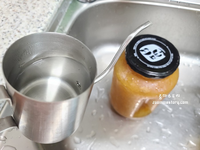 사실 얼마전 모과차를 구입하고 냉장고에 넣어 두었던 것이 화근이었다. 새 유리병은 간혹 내부 압력과 외부 압력으로 이난 차이로 인해 잘 안 열릴 때가 있다. 아무래도 그런 이유라는 생각에 일단 주방 싱크대 주변에 온도차를 극복 하게끔 내 놓았다. 그런데 언제까지 기다려야 하는지 그냥 갑갑해 당장 이 방법 저 방법 시행해 보기로 했다.