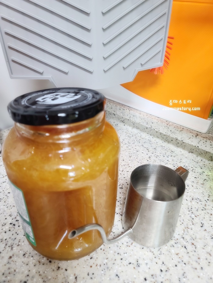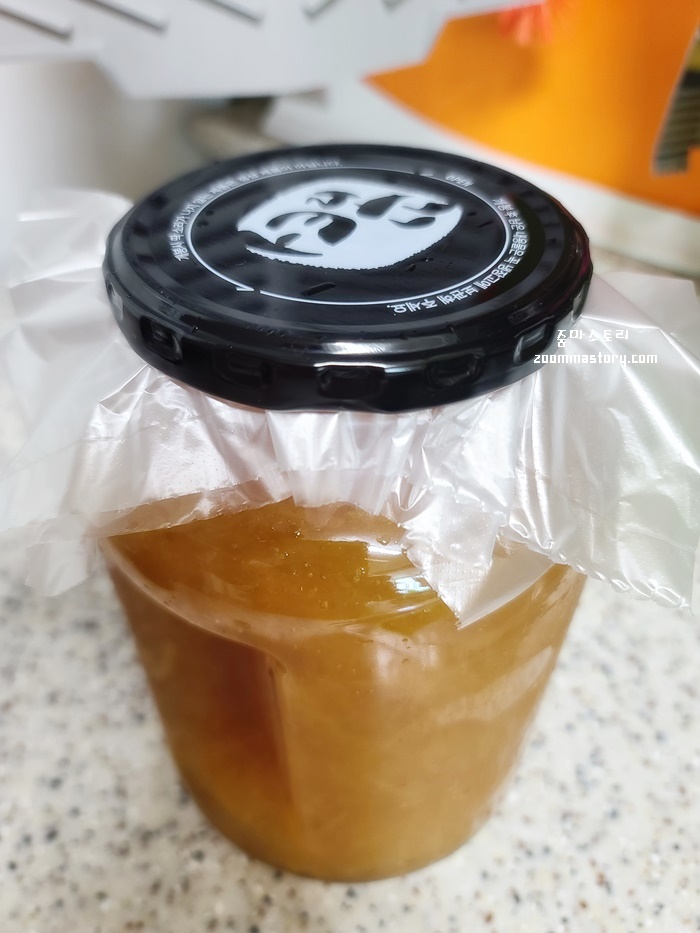 유리병 뚜껑을 열고 차 한 잔 마시기 위해 컵을 내리면서 '아하! ' 이것도 알려주면 되겠다 싶어 사진 2장 찍었다. 그건 바로 먹던 제품을 보관할때 뚜껑을 쉽게 여는 방법이다.