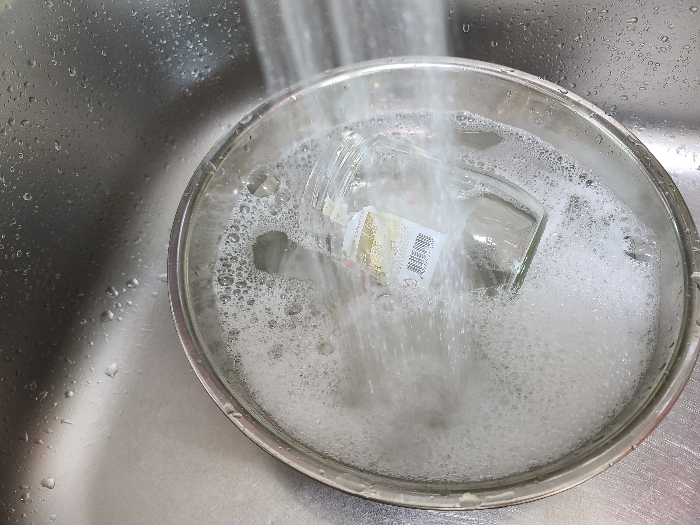필요한 것은 주방세제와 물만 있으면 됩니다. 너무 간단하죠. 유리병이 잠길 정도의 물을 담은 뒤 주방세제 한 방울을 넣어 잘 풀어 줍니다. 그리고 그냥 30분 ~ 1시간 정도 방치하면 됩니다. 그 시간이 지겹다면 집 안 청소 이곳저곳을 하다 보면 금방 흘러가겠죠.