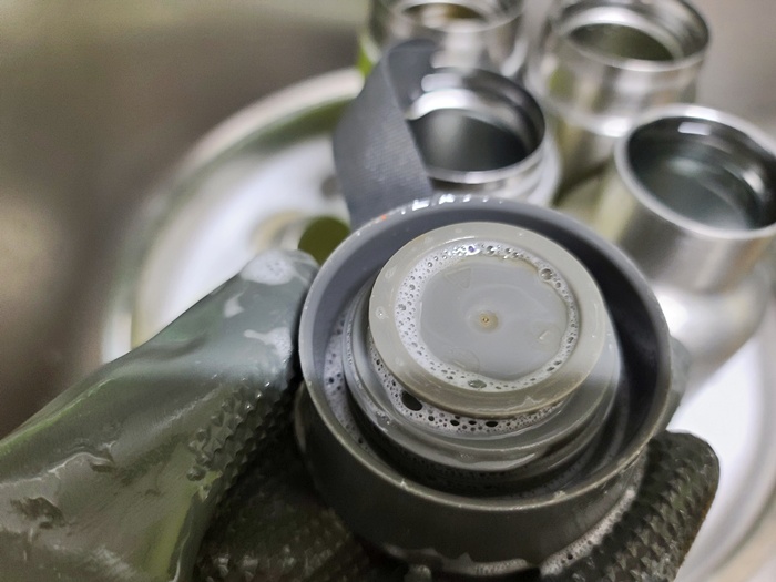 바로 꺼내서 보니 많이 착색된 텀블러 뚜껑이 깨끗해진 모습이예요. 이제 솔과 수세미로 닦기만 하면 됩니다. 꼬질꼬질한 때가 뜨거운 물로 인해 정말 잘 지워집니다.